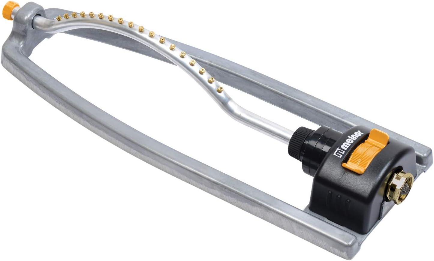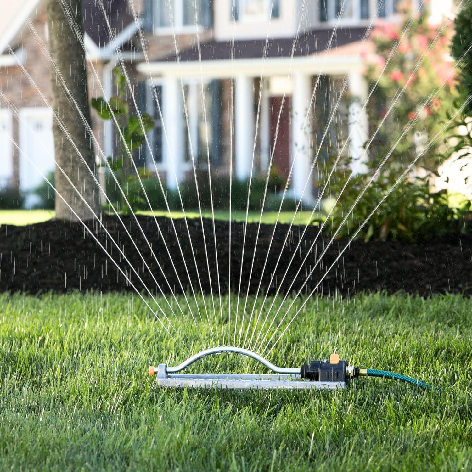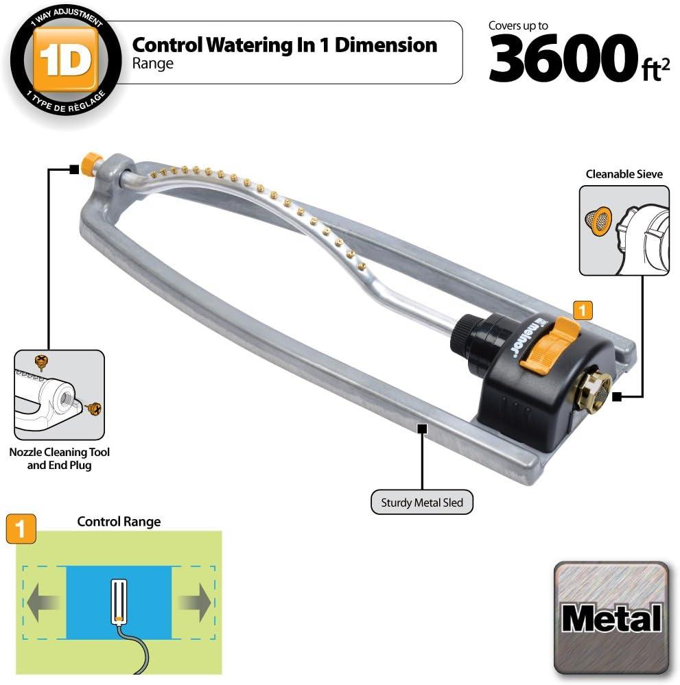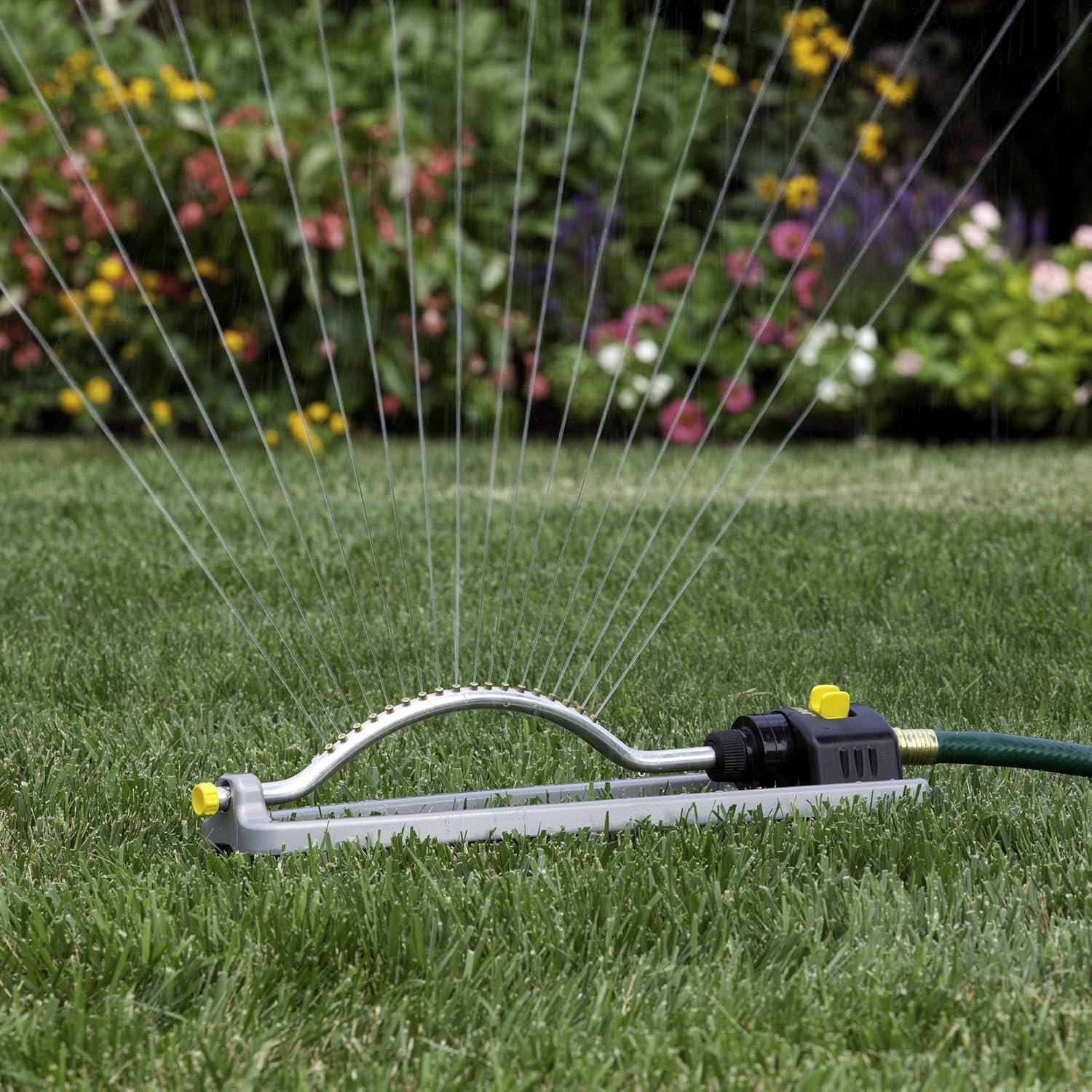Get your yard back in summer shape with a dependable premium metal oscillating sprinkler. The gentle watering & even coverage is great for helping a newly seeded lawn grow. Water A small patch or large section of the lawn by adjusting the watering range with easy to use tabs. Durable metal construction & 18 brass nozzles ensure this sprinkler will last for seasons of reliable use. Water more than just the lawn, It works great to keep flower beds blooming & vegetable gardens bountiful all-season long.