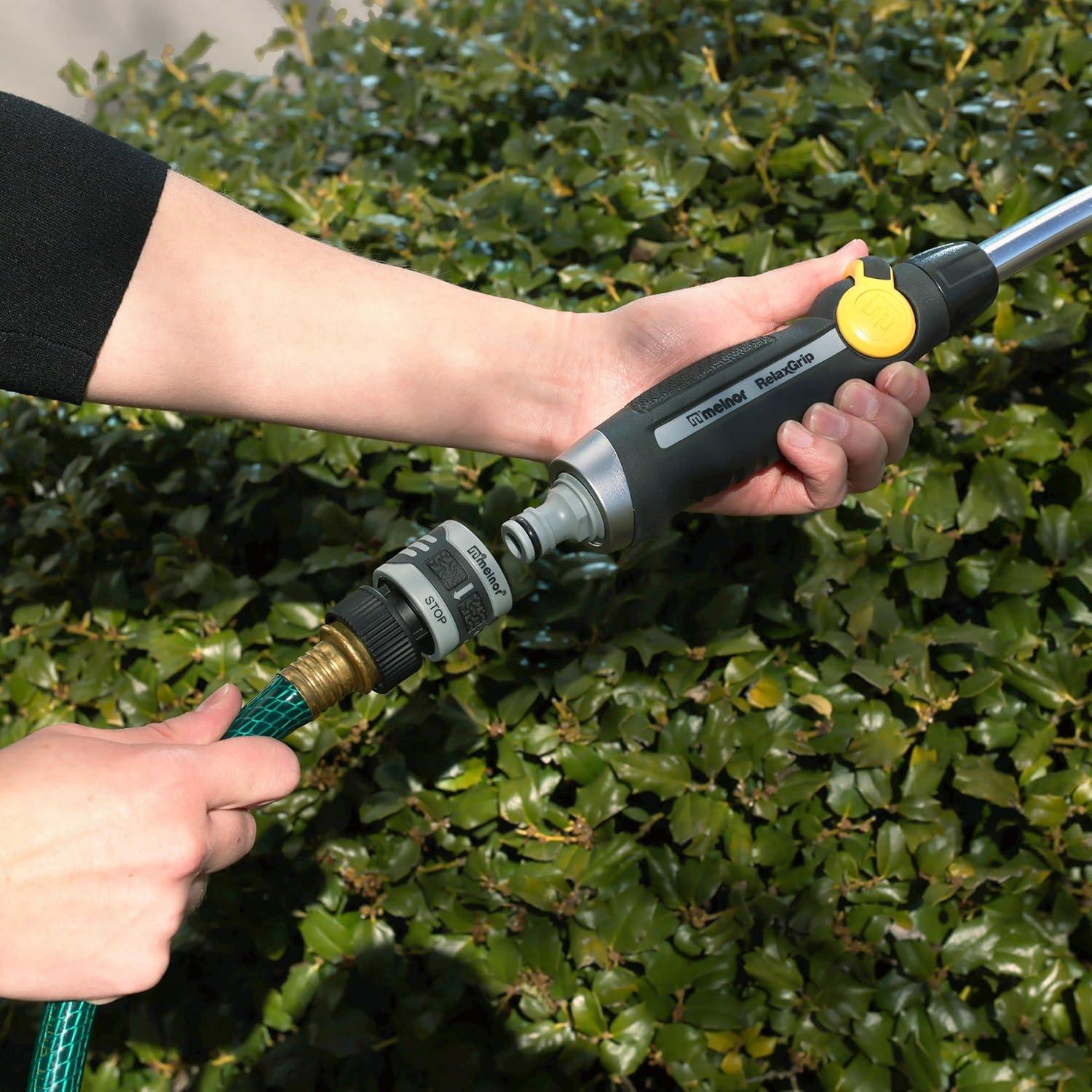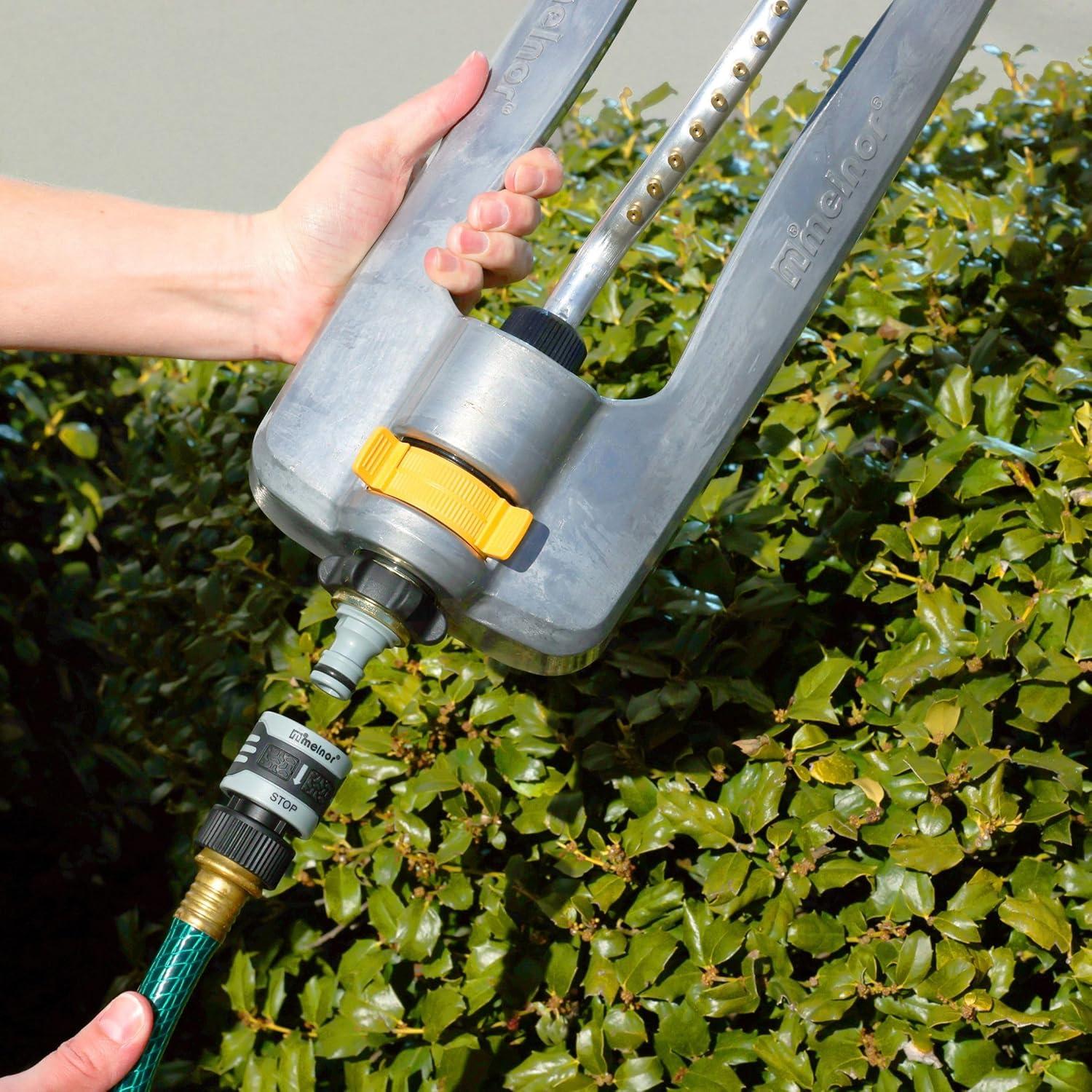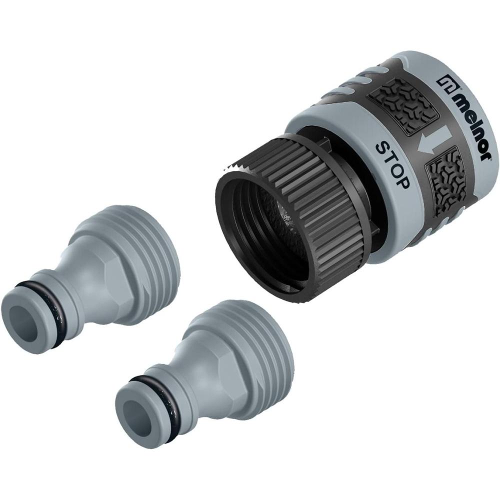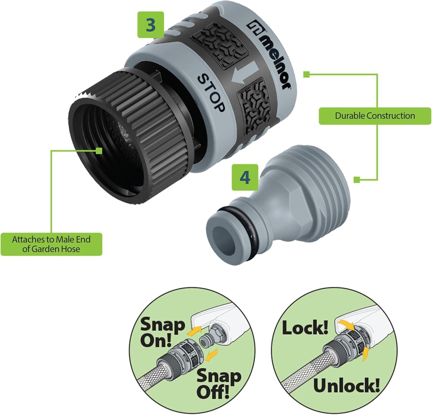 The Melnor QuickConnect™ System makes switching watering tools fast and easy. The 5-Piece Starter Set prepares both ends of your hose for the QuickConnect™ system and includes adapters for your faucet and two watering tools. The Product Adapters stay in place on your nozzles, wands, or sprinklers so you can quickly connect and disconnect tools. You can even change tools while the water is running. Put one Product Adapter in your watering wand to water your hanging baskets and add one to your favorite adjustable nozzle to spray a larger area. Make an easy switch between the two tools without going back to the faucet to turn off the water. The locking feature keeps tools connected and prevents unintentional disconnection while watering. A must-have for multi-tasking, the Melnor QuickConnect™ System makes connections easy.
