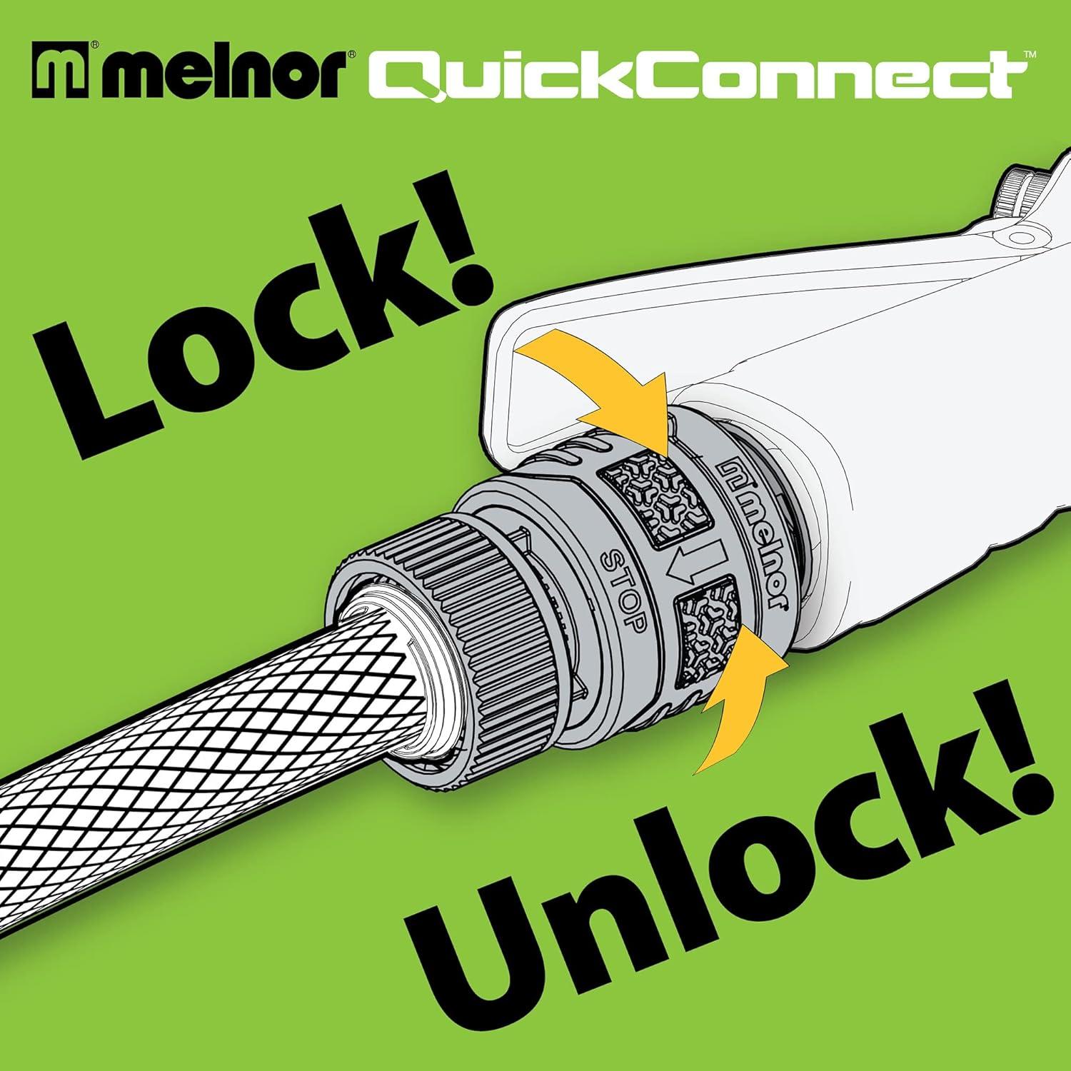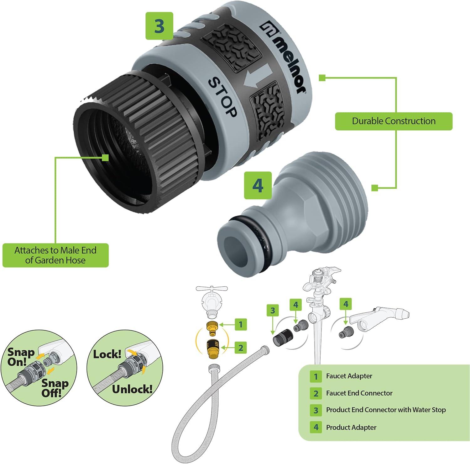 The Melnor QuickConnect™ System makes switching watering tools fast and easy. The 5-Piece Starter Set prepares both ends of your hose for the QuickConnect™ system and includes adapters for your faucet and two watering tools. The Product Adapters stay in place on your nozzles, wands, or sprinklers so you can quickly connect and disconnect tools. You can even change tools while the water is running. Put one Product Adapter in your watering wand to water your hanging baskets and add one to your favorite adjustable nozzle to spray a larger area. Make an easy switch between the two tools without going back to the faucet to turn off the water. The locking feature keeps tools connected and prevents unintentional disconnection while watering. A must-have for multi-tasking, the Melnor QuickConnect™ System makes connections easy.
