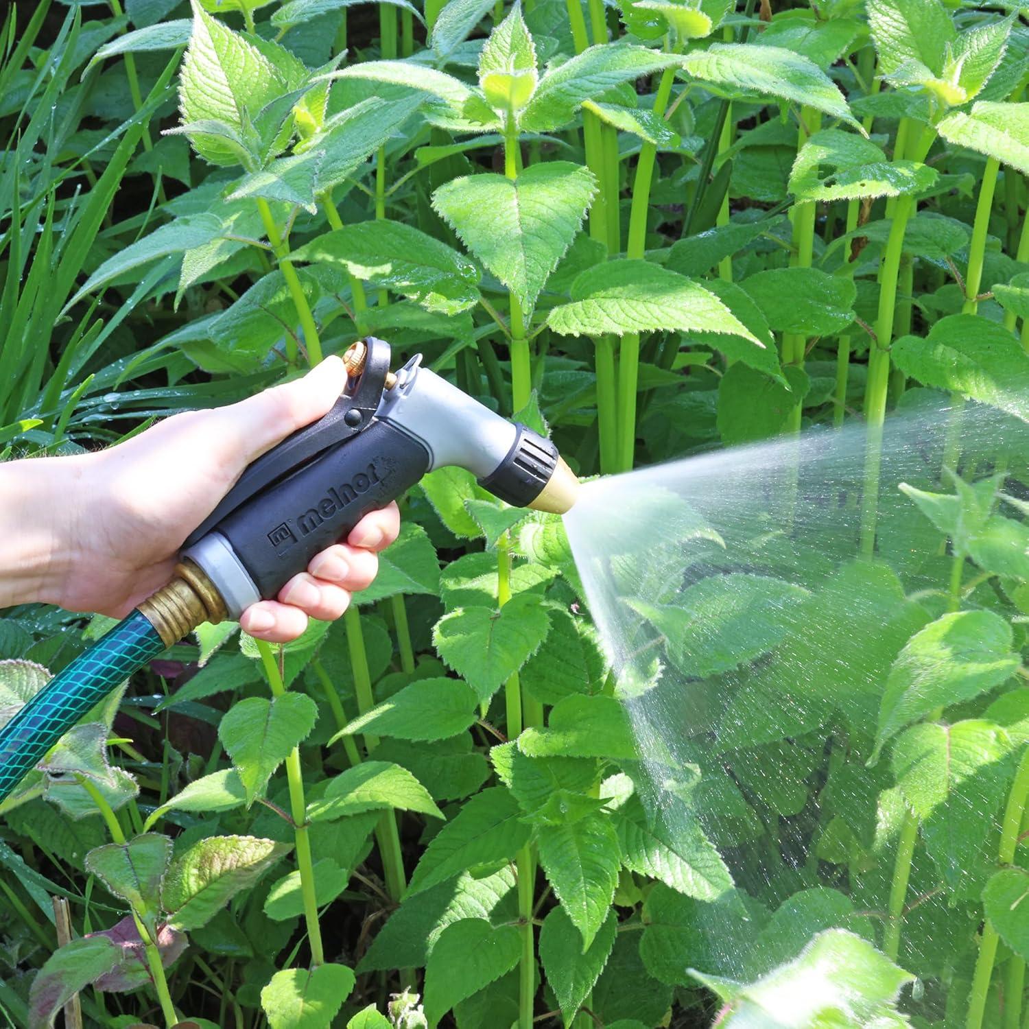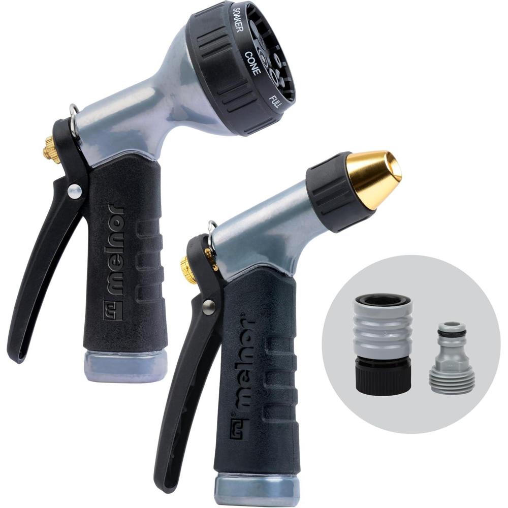 Make every watering task easier with the Melnor 7-Pattern & Adjustable Nozzle Set—your complete solution for flexible, dependable outdoor watering. This set includes two durable nozzles for garden hose use: a 7-pattern garden hose watering nozzle for delicate tasks and a fully adjustable nozzle for precise control, from a gentle mist to a strong stream. Crafted from high-quality metal and built to last, these nozzles for water hoses feature rubberized, slip-resistant grips and trigger locks for extended comfort. Ideal for watering flower beds, vegetables, or shrubs, these nozzles give you the versatility to tackle a wide range of gardening and yard tasks. Included is the QuickConnect Starter Set, a quick garden hose connector system that allows you to change between nozzles, Melnor wands, or garden sprinklers without shutting off the water. Pair it with other Melnor hose connector replacements, Melnor shut-off valves, or even your sprinkler with timer setup to create a fully customized watering solution. Backed by a Limited Lifetime Warranty, this garden hose nozzle combo gives you quality and convenience in one powerful set.