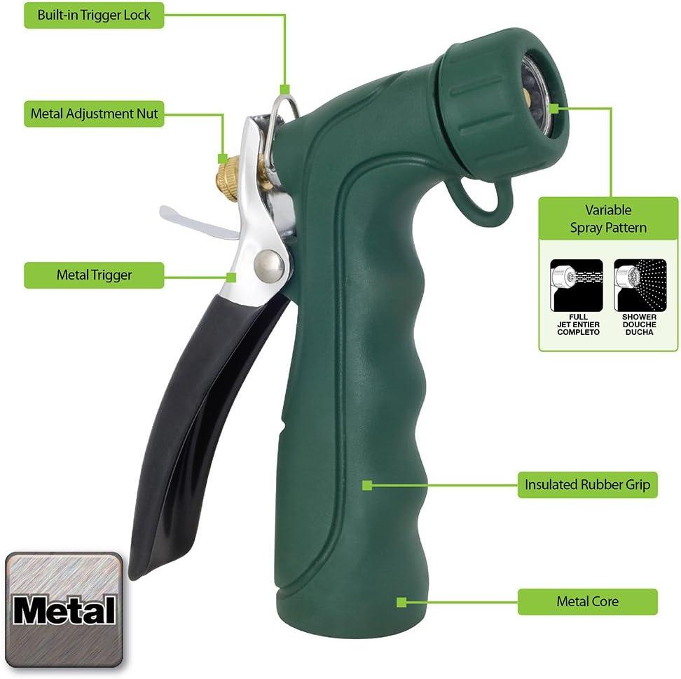 For on-the-job watering or outdoor chores, the Insulated Nozzle can handle tough abuse and hard use. The insulated grip stays comfortable and secure in your hands. The adjustable tip goes from a rinsing spray to a strong jet. The variable spray pattern makes all your watering chores a breeze. Built with a durable metal core, sturdy all metal rear trigger and rubberized grip that will last for years.